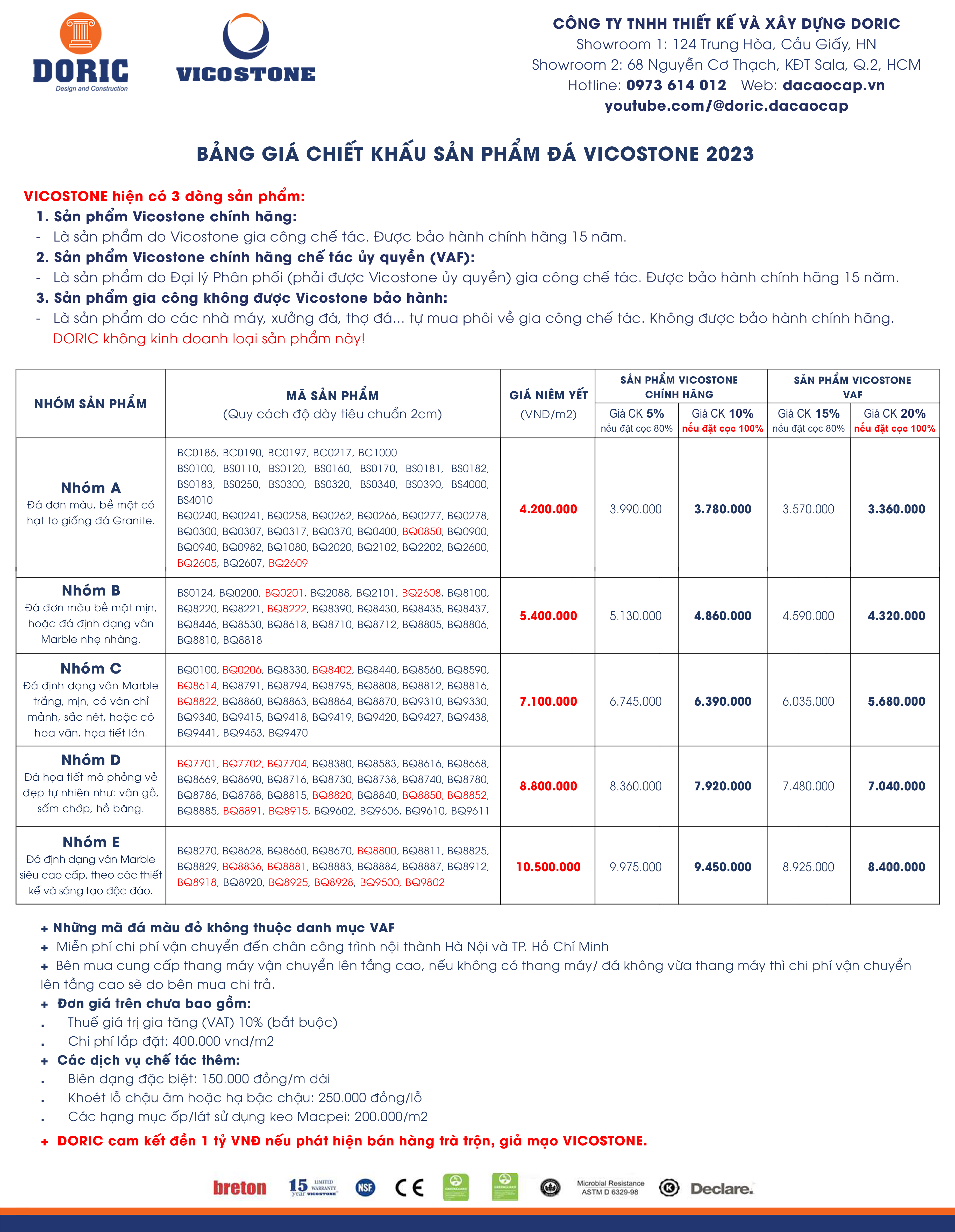 CHI TIẾT BẢNG GIÁ SẢN PHẨM VÀ CHI PHÍ LẮP ĐẶT CỦA DORIC: